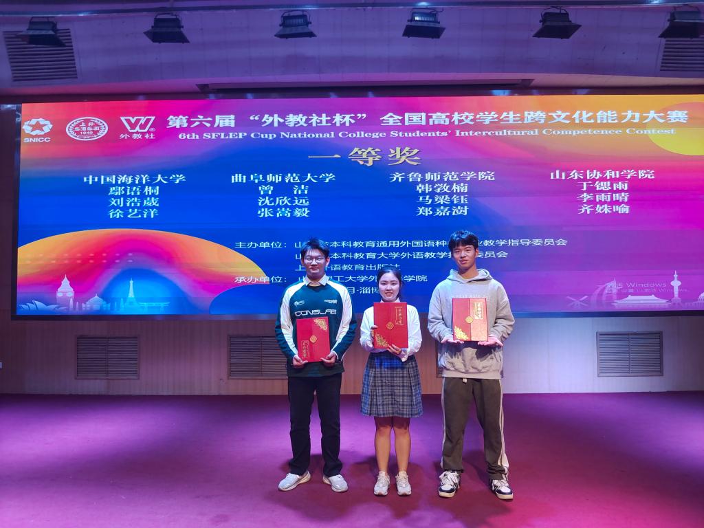 承办的校级初赛选拔,推选曾洁团队代表我校参加山东赛区比赛。在省赛阶段,三位学生以扎实的英语综合应用能力、出色的跨文化沟通能力和良好的思辨能力,充分展现了我校学子朝气蓬勃、积极向上的精神风貌。