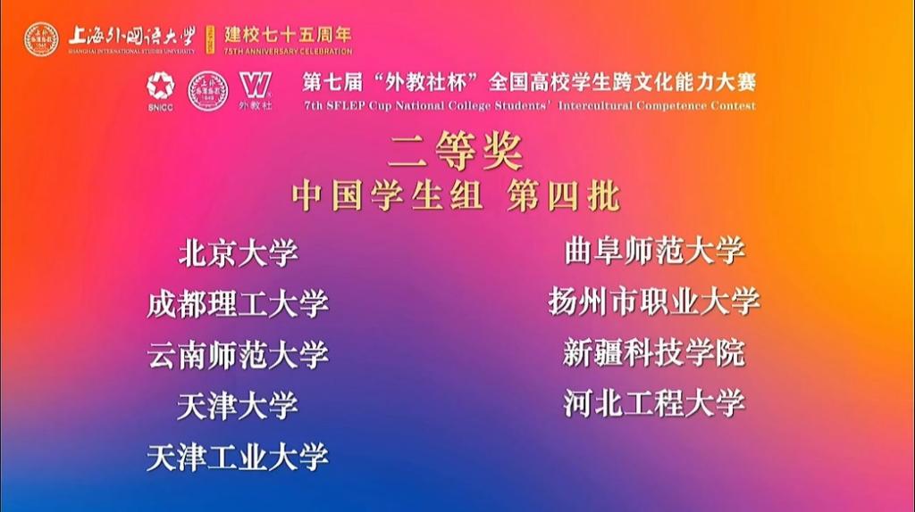 高度重视学生英语综合素质和实践能力的培养,不断深化大学英语教学模式创新与改革,加快特色优质拓展课程资源建设,加强课堂教学质量管理,积极推进过程性教学质量评价,人才培养质量不断提升。通过鼓励学生积极参与各类专业比赛,激发学生学习兴趣,培养学生创新思维、团队合作以及解决实际问题的能力,营造“以赛促教、以赛促学”的良好氛围。此次参赛获奖不仅是对我校大学英语教学质量的肯定,更是对我校学子在学术探索与文化传承方面不懈努力的认可。