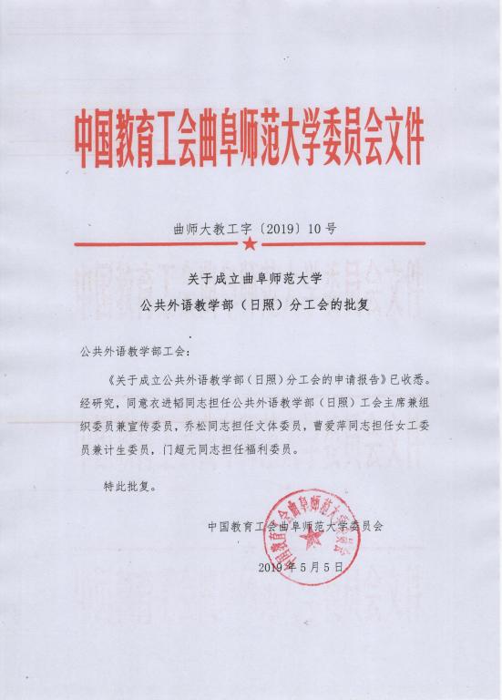 曲师大教工字〔2019〕10号关于成立黄色动漫 (日照)分工会的批复