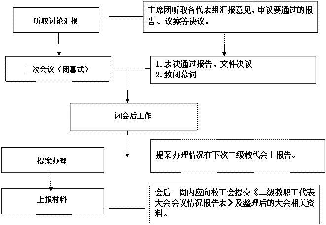 二级教职工代表大会预报告表;会后一周内应向校工会提交二级教代会召开情况的报告及会议审议通过的相关报告、文件、决议等材料。