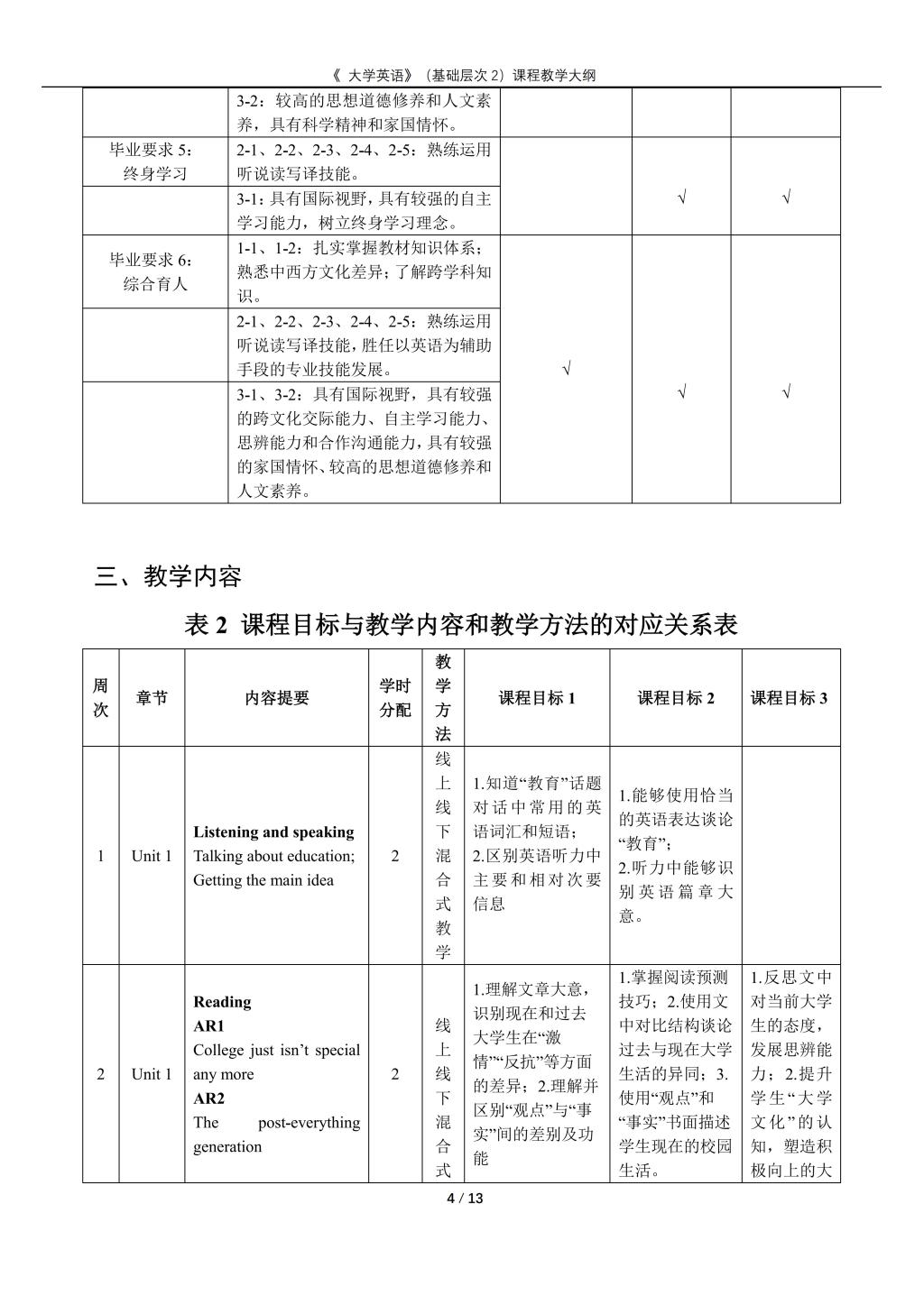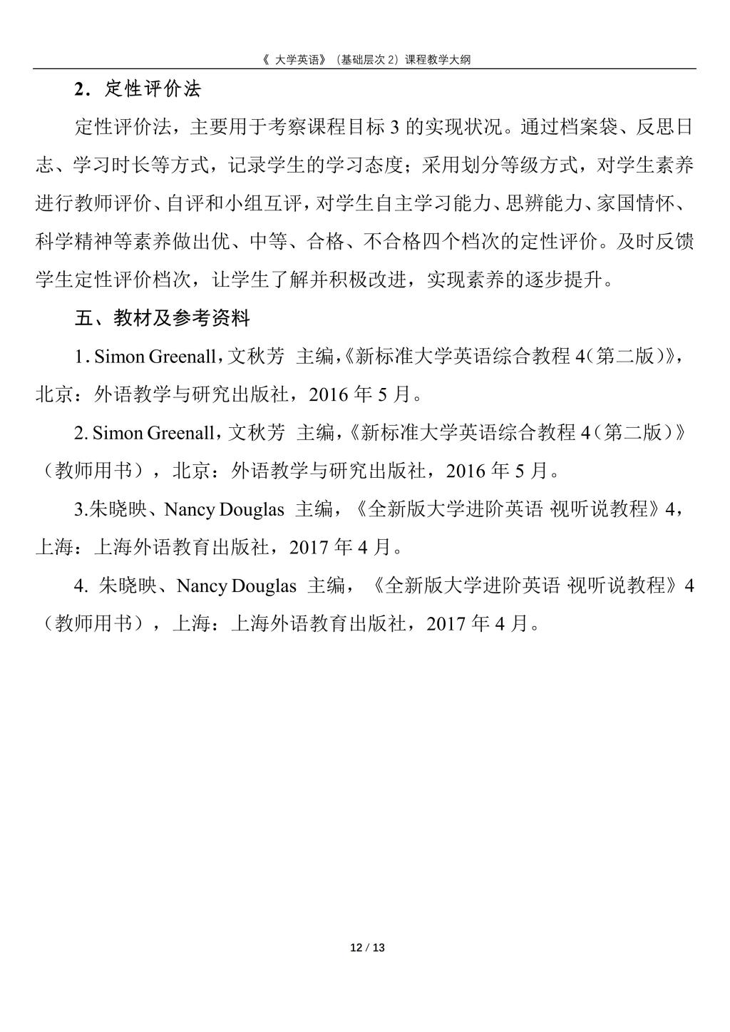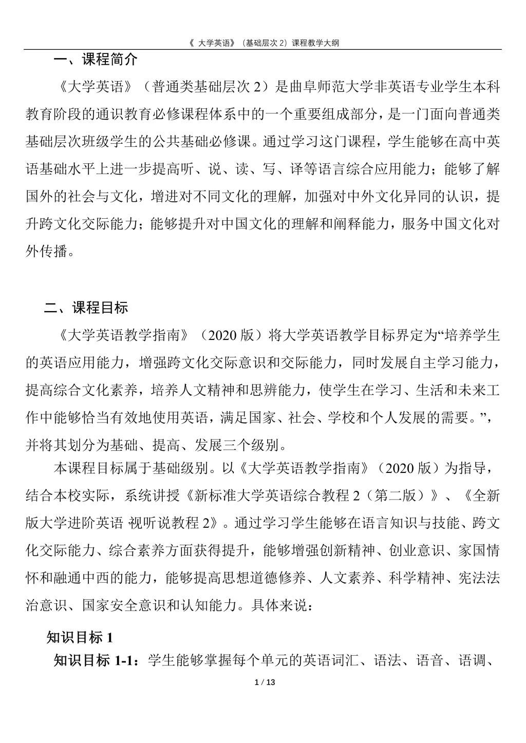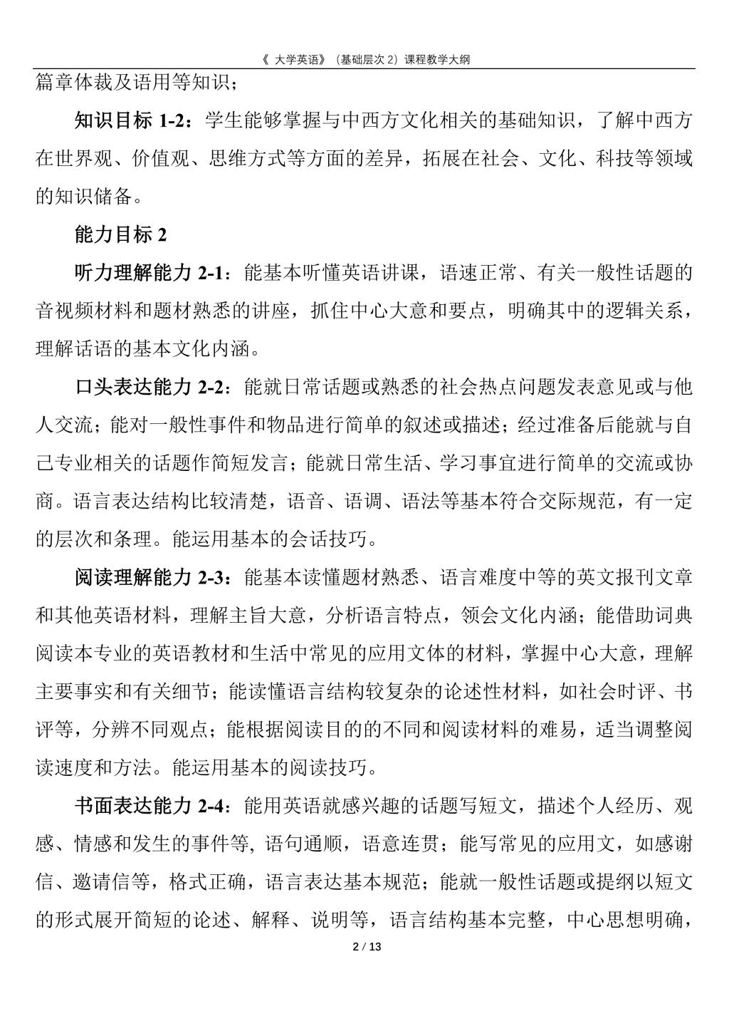 大学英语(普通类基础层次2)课程教学大纲(2022版)