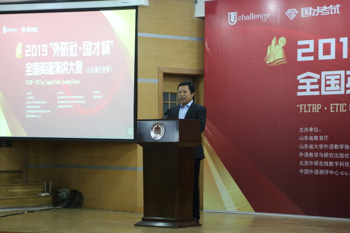 主任王广成教授在致辞中指出:“Uchallenge大学生英语挑战赛”系列,是由山东省教育厅、外语教学与研究出版社等单位联合主办的一项公益赛事,“大赛以高远的立意和创新的理念,顺应时代发展大势,聚焦国家时事热点。大赛既是当代大学生展现风采、实现自我的舞台,也是外语教育领域凝聚创新、融通中外的交流媒介。”是唯一纳入“中国高校创新人才培养暨学科竞赛评估项目”的英语竞赛。希望参赛同学在比赛中能够收获赛场经历,学习优秀选手身上的亮点;领悟语言表达魅力,目睹思想碰撞火花;在高手云集的舞台上展现自我、提高自我。作为此次比赛的具体承办者,一定本着公平、公正、公开的原则组织赛事,认认真真、尽心尽力地为大家做好服务。